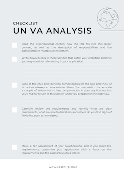 You'll get a downloadable PDF with a checklist that you can use to quickly run through the analysis whenever you're preparing to send in a UN job application.